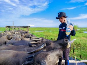 Adapun Kegiatan Bapak Rahmat Hidayat seperti gambar di samping, beliau sedang memberikan minum Air Garam ke Kerbau Rawa yang sudah masuk kandang. Adapun fungsi dari Air Garam tersebut adalah